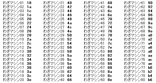 L+R同時押しで適用されます。 ID変更を使うときは、裏IDをお小遣いにコピーを使い、 バトルポイント999(修正版)(5(質問)スレ949・Wiki内コメント"949")94000130 fcff0000 b21c6588 00000000 b0000004 00000000 10006864 000003e7 d2000000 00000000 L+R同時押しで適用されます。 バトルタワーランク10(7(質問)スレ"949")94000130 fcff0000 b21c6588 00000000 b0000004 00000000 20006867 0000000a d2000000 00000000 L+R同時押しで適用されます。 シングルバトル前回連勝数98(6(質問)スレ68・Wiki内コメント"949")94000130 fcff0000 b21c6588 00000000 b0000004 00000000 10006238 00000062 d2000000 00000000 L+R同時押しで適用されます。 ワザマシン中身変更(4(解析)スレ"Y.S.")94000130 FDFF0000 B21C6588 00000000 B0000004 00000000 94000130 FEFF0000 00000890 01D3005D D0000000 00000000 DA000000 00000892 D3000000 00000000 520CC5AC E1C100B0 DC000000 00000004 D0000000 00000000 D7000000 020FA318 D2000000 00000000 L+Rを押すとどうぐ一つ目がハートのウロコ467個になるので、 ボックス内のポケモンを選択して「マーキング→けってい」で経験値変更(4(解析)スレ"1スレ148")0206DAB0 47004800 0206DAB4 023A9011 023A9010 60B84801 023A9014 BDF0B013 023A9018 XXXXXXXX 他のコードと同時使用はしないでください。 ボックス内のポケモンを選択して「マーキング→けってい」でとくせい変更(4(解析)スレ"1スレ148")0206DAB0 737820XX ※XXの値はこちら ボックス内のポケモンを選択して「マーキング→けってい」でポケルス感染(4(解析)スレ"1スレ148")0206DAB0 76882001 他のコードと同時使用はしないでください。 全ての技マシンの中身を変更(4(解析)スレ"Y.S.")02072EDC 4770E7FF 94000130 FDFF0000 B21C6588 00000000 B0000004 00000000 94000130 FEFF0000 00000890 01D3005D D0000000 00000000 DA000000 00000892 D3000000 00000000 D6000000 02072EE8 D2000000 00000000 L+Rを押すとどうぐ一つ目がハートのウロコ467個になるので、 ボックス内のポケモンを選択して「マーキング→けってい」で、卵が"もうすぐ生まれそう"状態になる(4(解析)スレ"Y.S.")0206DAB0 73382000 他のコードと同時使用はしないでください。 ボックス内のポケモンを選択して「マーキング→けってい」で努力値変更(4(解析)スレ"1スレ148")0206DAB0 47004800 0206DAB4 023A9011 023A9010 61384803 023A9014 82B84801 023A9018 BDF0B013 023A901C 0000ZZYY 023A9020 XXWWVVUU UU:最大HP努力値 ポケモンにボールを持たせるとそれが捕まえた時のボールになる(4(解析)スレ"1スレ148")0206D8C0 01DA0520 ※もたせたボールは消えてしまいます。 野生のポケモン必ず色違いで出現(4(解析)スレ"1スレ148")021C6588 00000000 0206EBA8 47004800 0206EBAC 023AA001 E23AA000 0000003C 6800480D 490B6840 88011808 9C0D8842 40510C24 20074061 04244041 940D430C ボックス内のポケモンを選択して「マーキング→けってい」で色違いに変更(PAR用改造コード_質問スレ510)0206DAB0 47004800 0206DAB4 023A9011 023A9010 88049800 023A9014 88BE8845 023A9018 407788FF 023A901C 0A24407C 023A9020 407D70C4 023A9024 407D2707 023A9028 B0137005 023A902C 46C0BDF0 性別が変化します。 ボックス内のポケモンを選択して「マーキング→けってい」でなつき度最大0206DAB0 733820FF 他のコードと同時使用はしないでください。 全ポケモン全技マシン使用可能(4(解析)スレ"1スレ148")0206D25C 00D400D4 0206D260 00D400D4 0206D2F8 E0044D00 0206D2FC FFFFFFFF どのボールでも確実に捕まえられる(4(解析)スレ"1スレ148")522357E0 5C514A7E 022357E8 E0059000 022357F8 04002001 022357FC 90003801 D0000000 00000000 コメント(ご自由にどうぞ)質問はこちら→PAR用改造コード_質問スレ Part2 |